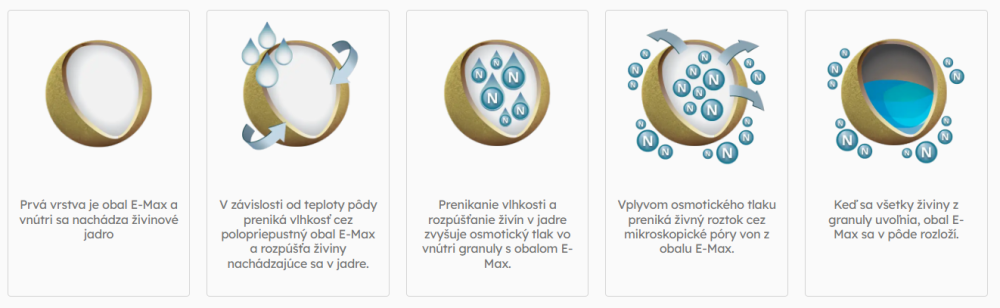 Technológia E-Max zabezpečuje postupné uvoľňovanie živín počas 2-3 mesiacov.
