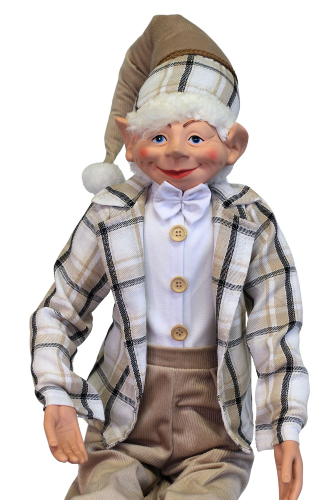 Sediaci vianočný škriatok v elegantnnom oblečení, ideálny ako ozdoba na stromček, do detskej izby alebo na krb. Postavička je veľmi milá, dôkladne vypracovaná.