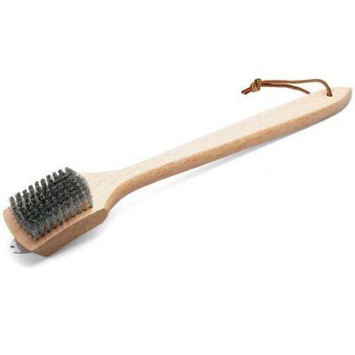 Profesionálne čistenie so štetinami z nerezovej ocele a s pútkom na zavesenie z kože. Doporučujeme na všetky grily na drevené uhlie.