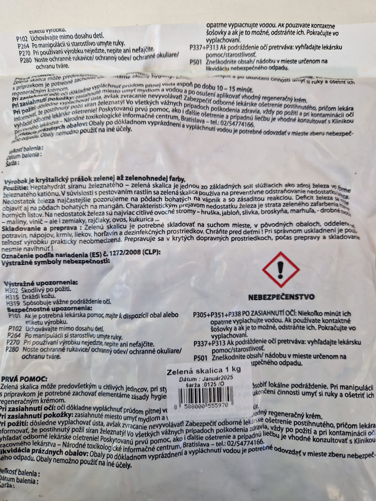 Použitie zelenej skalice AgrichemChloróza: Aplikuje sa ako 0,2 % roztok (20g/10l vody) na listy, najlepšie s močovinou pre lepšiu účinnosť.